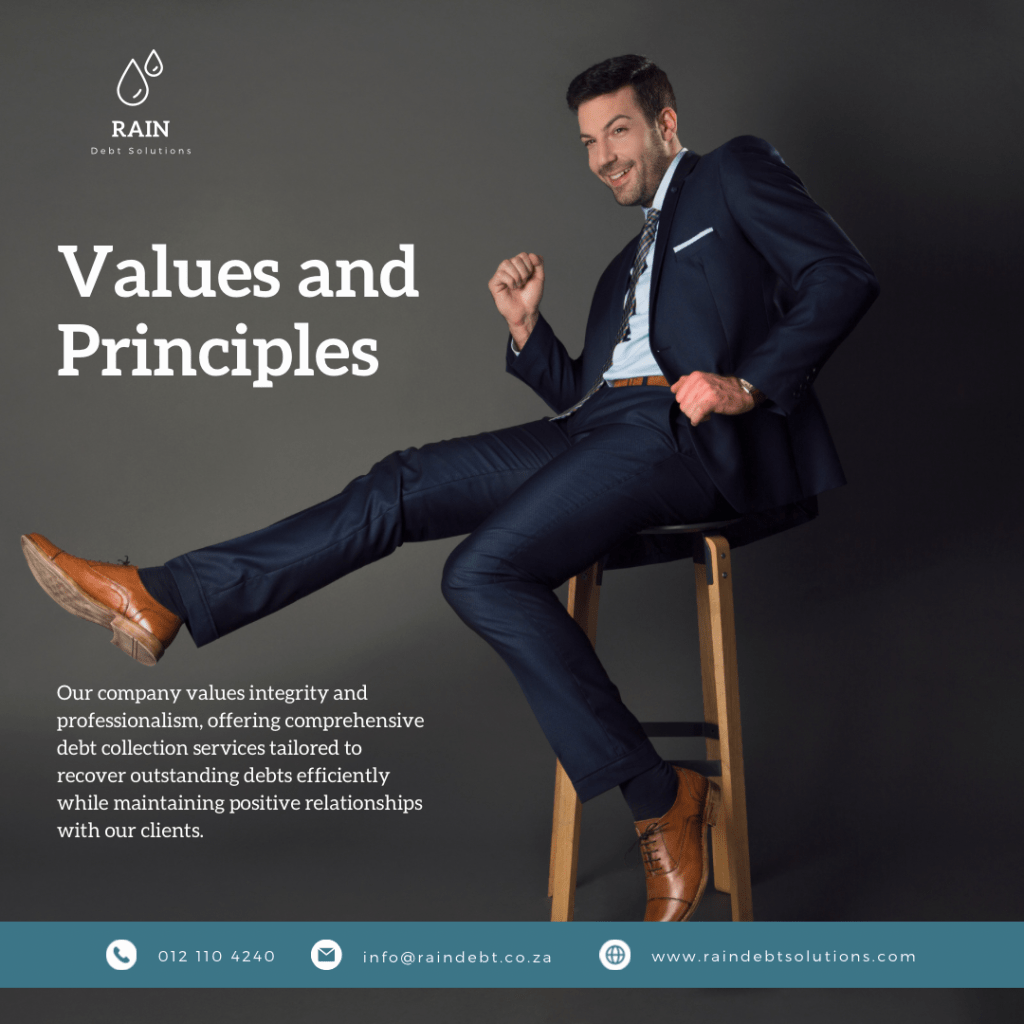Our company principles include: Operating on a “NO COLLECTION-NO CHARGE” basis. Utilising an advanced collection system. Processing and prioritising debt portfolios efficiently. Specialising in Soft Collections. Implementing a legal-oriented collection process, Having a national presence with soft collections. Aligning our actions with the National Credit Act. Following best business practices in our operations. Providing specialised training for debtor consultants handling client accounts. Sending demand letters on behalf of clients. Employing experienced staff, trusted field workers, and an alliance network.